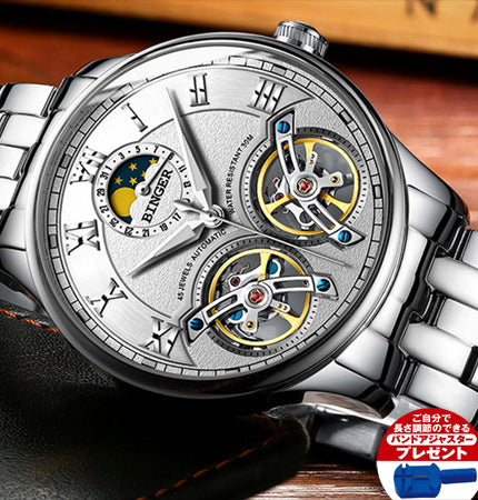 欧米でも高品質な機械式時計fr評価されているBINGER社の最新時計。精度を追及したツインテンプを搭載。ふたつの小窓からテンプが駆動する様を楽しめます。ロマンチックなムーンフェイズも相まって袖元を印象的に演出してくれること間違いなし!月の満ち欠けを擬似的に表示する月齢表示窓『ムーンフェイズ』。機械式時の中でも調整が非常に難しいとされ、搭載されている時計を探すのが困難なほど貴重です。傷に強いサファイヤクリスタル風防と手首にしっくりなじむ重厚感のあるステンレス無垢ベルトで安心感も抜群。今ならバンドアジャスタープレゼント中です!!
