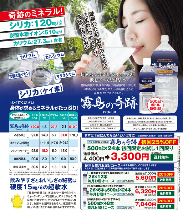 霧島大地の奥深くに湧く、今話題の『シリカ』をはじめミネラル成分がたっぷり溶け込んだ温泉水。しかも硬度15mg/Lの超軟水!そんな温泉水から作られた飲みやすくて美味しい飲料水です。人間の全身を構成する重要なミネラル『シリカ』は体内で生成することができません。昔から食事でそれを補って来ましたが、現代の食文化ではミネラルが足りず、普段の食事だけではそれを補いきれません。シリカ含有量120mg/Lの「霧島の奇跡」は効率よくミネラル補給ができる飲むアルカリ温泉水です。そもそも今話題の成分『シリカ(ケイ素)』とは血管・関節・軟骨・骨・爪・髪の毛・肌・歯など全身を構成する重要な成分です。地球上で2番目に多い元素・シリカ(ケイ素)は私たちのカラダに欠かせないミネラルです。美肌や美髪のもとになる成分をしっかり結びつける働きや、カラダの錆びつきを防ぐ抗酸化作用、代謝促進作用があるとされており、特に美容や健康方面からシリカがもつ、さまざわなパワーに注目が集まっています。シリカは体内で生成できないため、失った分をしっかり補給することが大切です。そんな『シリカ』を「霧島の奇跡」なら1日コップ1杯(200ml)でOK!コップ1杯で24mg補うことができるのです。水道水や一般のミネラルウオーターに比べて「超軟水」でクセがなく、口に含むと軽やかで、とろりとした甘さが感じられます。お茶や水割りにはもちろん、湯豆腐や煮物、パン作りなどお料理にもおすすめです。ご家族皆さんで1日1杯の「霧島の奇跡」で錆びないカラダを作りましょう!※こちらの商品は毎月お届け定期コースです。※2Lx12本を毎月月初にお届け致します。